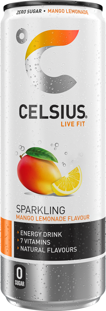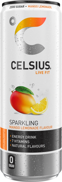 Koe mehukkaan mangon ja sitruunan makuinen sekoitus hedelmäisessä CELSIUS Mango Lemonade -juomassa.