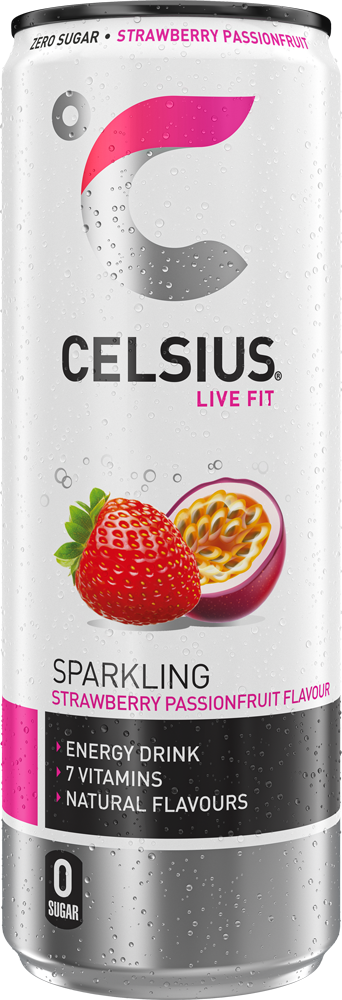 CELSIUS Sparkling Strawberry Passionfruit yhdistää kesäisen mansikan makean maun eksoottiseen passionhedelmän makuun luoden dynaamisen ja herkullisen makuelämyksen.